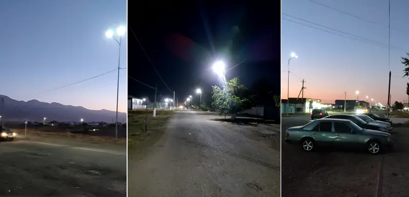 Вечернее освещение: 1, 3 — Мерке, улица Сарымолдаева, 2 — первое отделение, поселок Интернациональный.