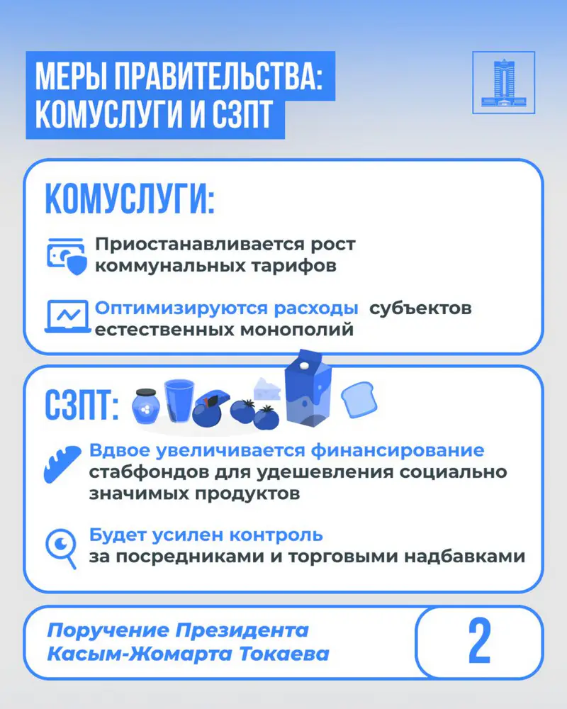 Помощник и пресс-секретарь Президента Руслан Желдибай сообщил, что Токаев поручил премьер-министру Бектенову до конца рабочей недели представить план конкретных мер, касающихся упорядочения реализации программы экономических реформ.
