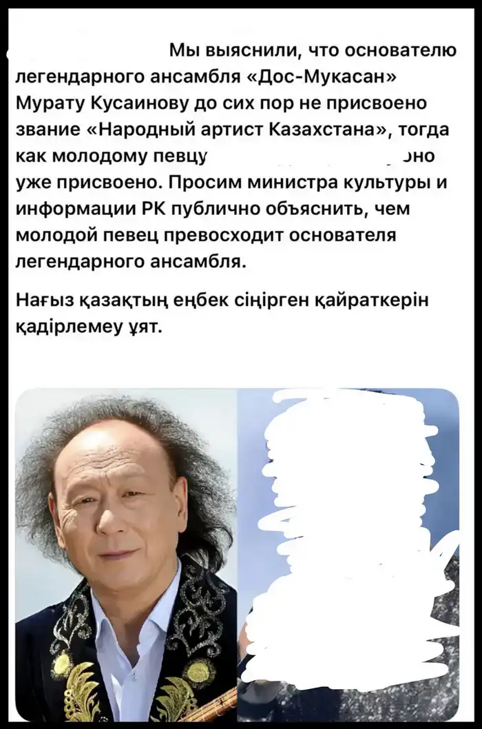 Солист ансамбля 'Дос-Мукасан' Мурат Кусаинов лишился звания, что вызвало бурное обсуждение в социальных сетях. Министерство культуры объяснило своё решение, однако подробности остаются неясными. Пользователи выражают удивление, учитывая популярность музык