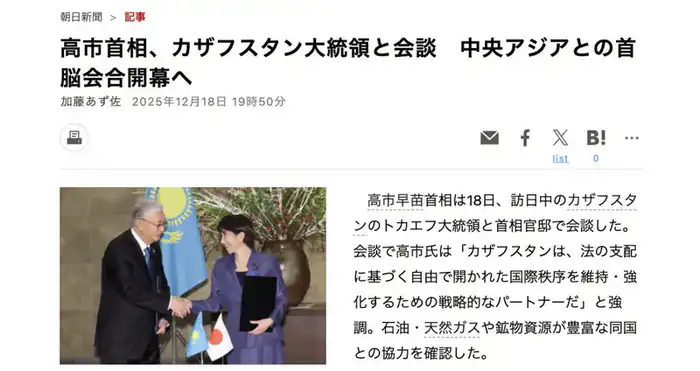 Национальные газеты, такие как Asahi Shimbun и Mainichi Shimbun, рассматривают визит Токаева в контексте региональной политики. В их материалах переговоры в Токио связываются с подготовкой первого в истории саммита Японии и стран Центральной Азии, где Казахстан выступает в роли ключевой страны.