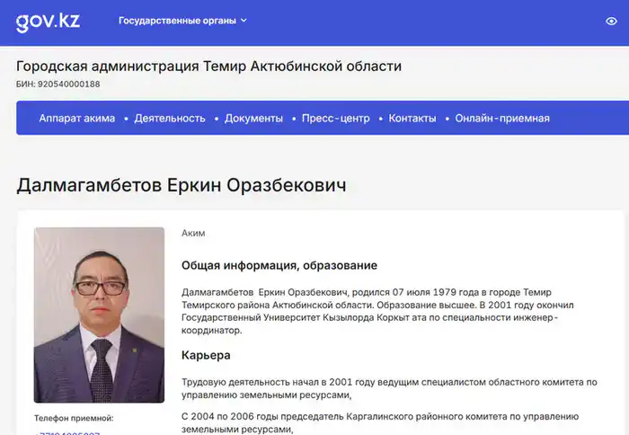 На сайте городской администрации Темира указано, что Еркин Далмагамбетов был назначен акимом города в июне 2024 года. До этого он работал в различных ТОО в качестве заместителя руководителя и возглавлял одну из частных компаний.