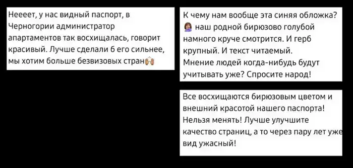 "За границей на него часто обращают внимание — он реально красивый", "Бирюзовый цвет и крупный герб — это наша фишка. Зачем делать очередной синий паспорт, как у всех?"