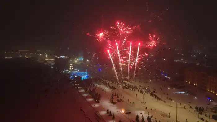 В Костанае жители вышли на центральную площадь, чтобы отметить Новый год. Фейерверк озарил небо, а улицы наполнились смехом и поздравлениями.