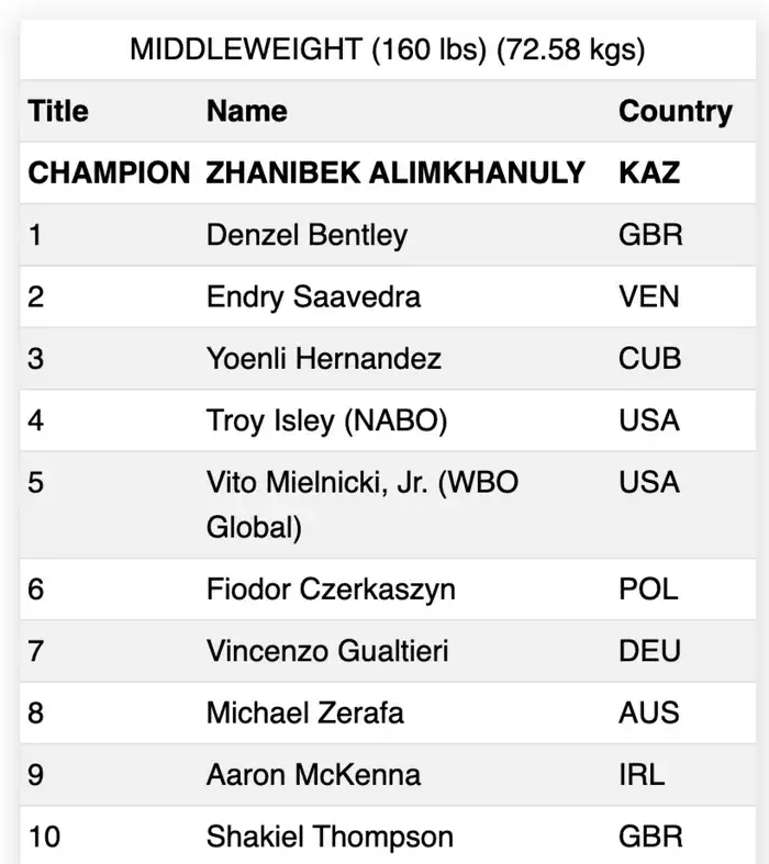 Всемирная боксерская организация (WBO) обновила рейтинги своих бойцов за январь 2026 года. Казахстанский чемпион мира Жанибек Алимханулы сохранил свое место на строчке лидера в среднем весе, оставаясь обладателем поясов WBO и IBF.