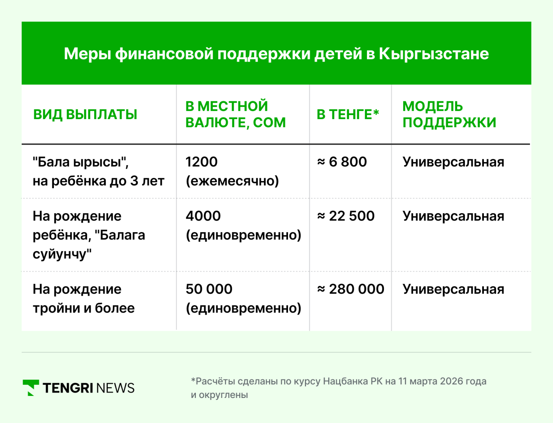 Также в Кыргызстане есть единовременное пособие на рождение ребёнка "Балага сүйүнчү" в размере четырёх тысяч сомов (около 22 500 тенге), которое получают все семьи. В случае рождения тройни и более государство выплачивает по пятьдесят тысяч сомов (около 280 000 тенге) на каждого ребёнка.