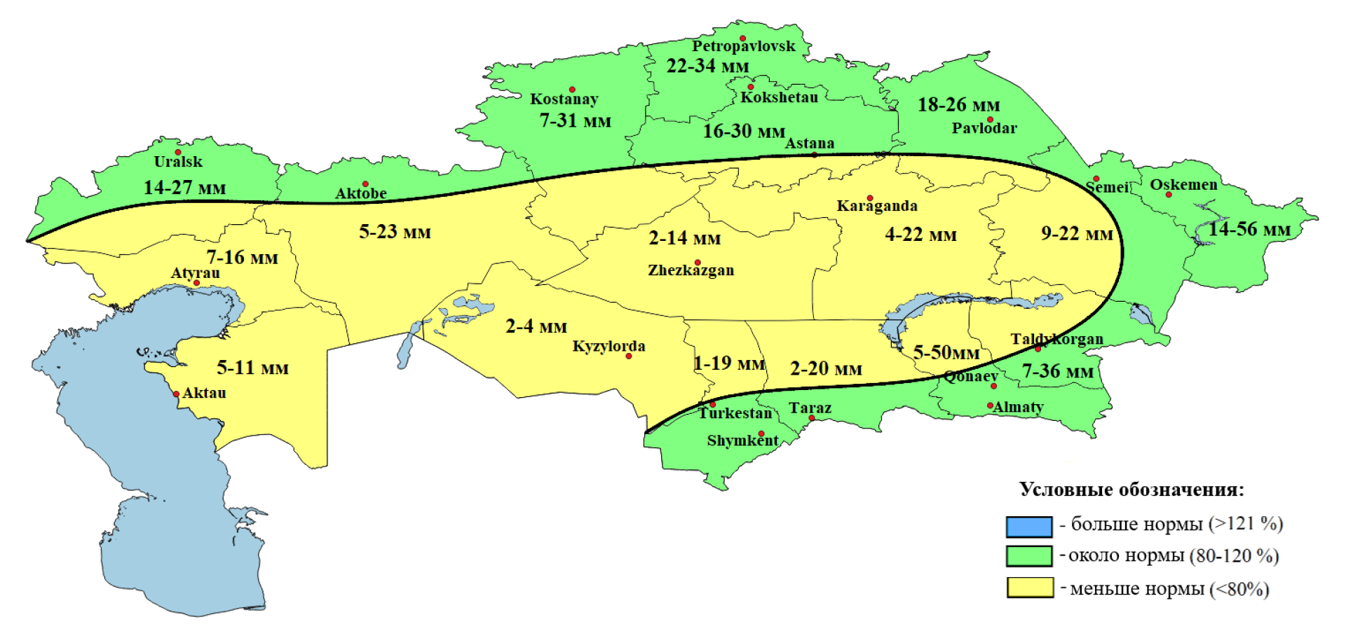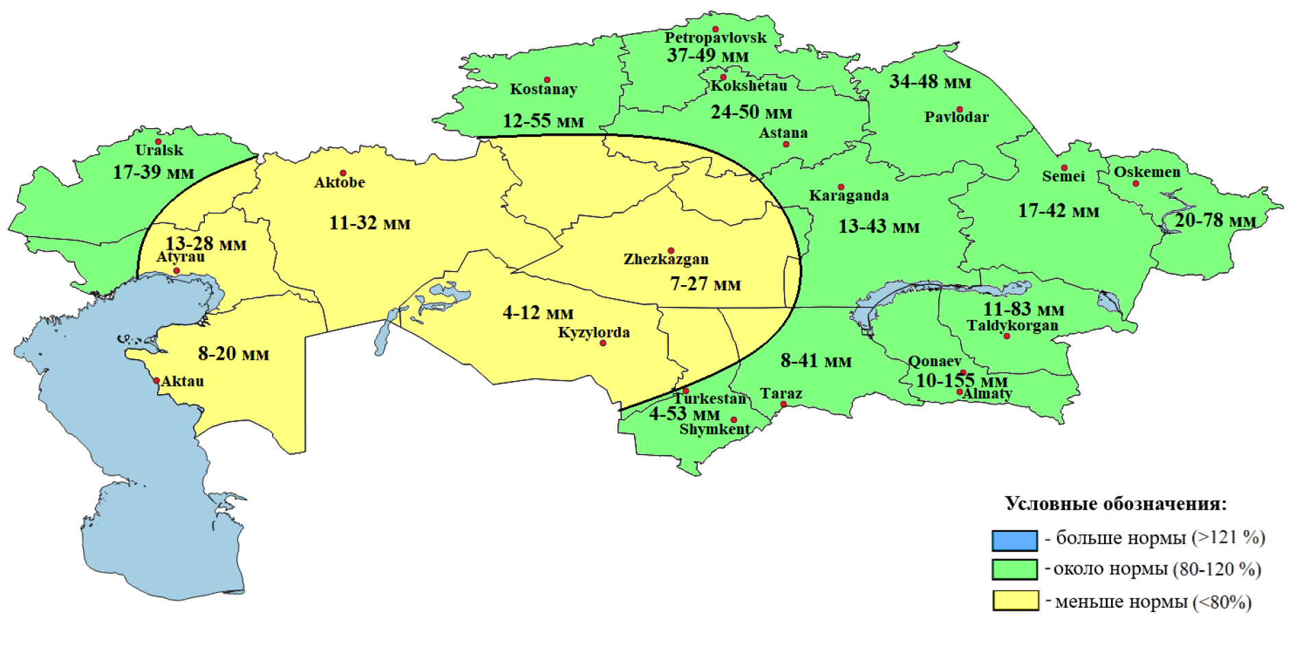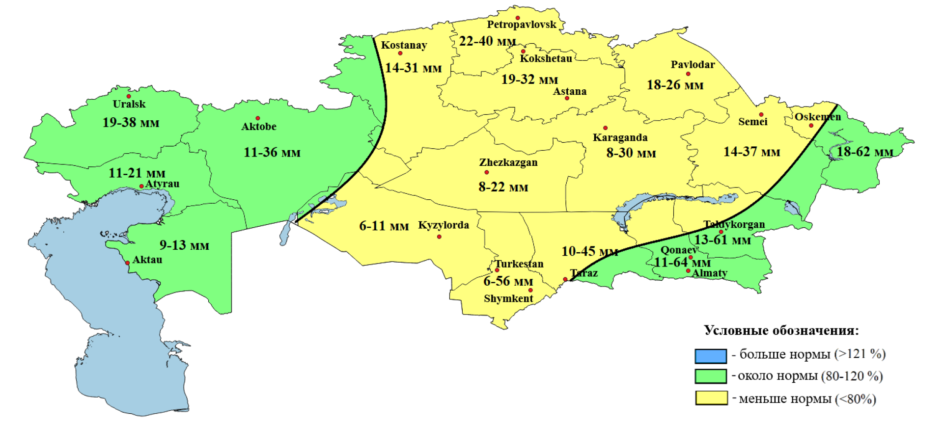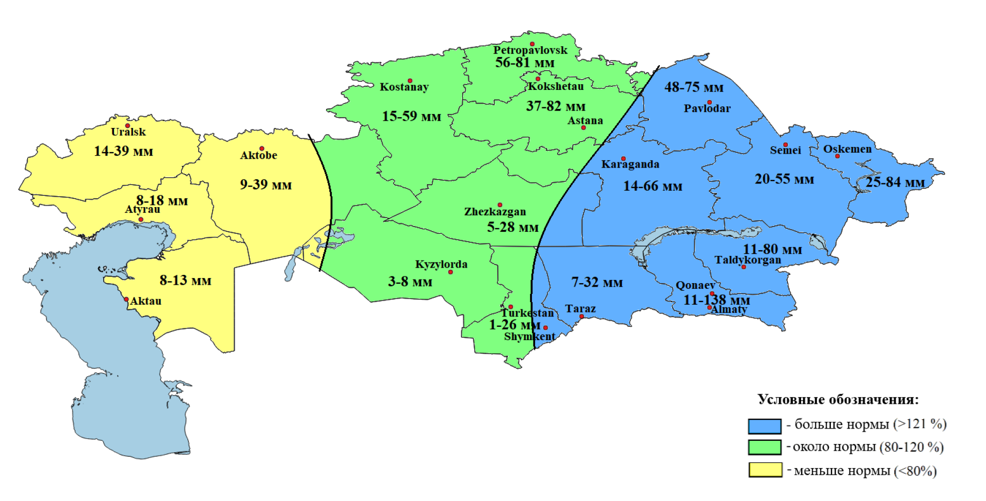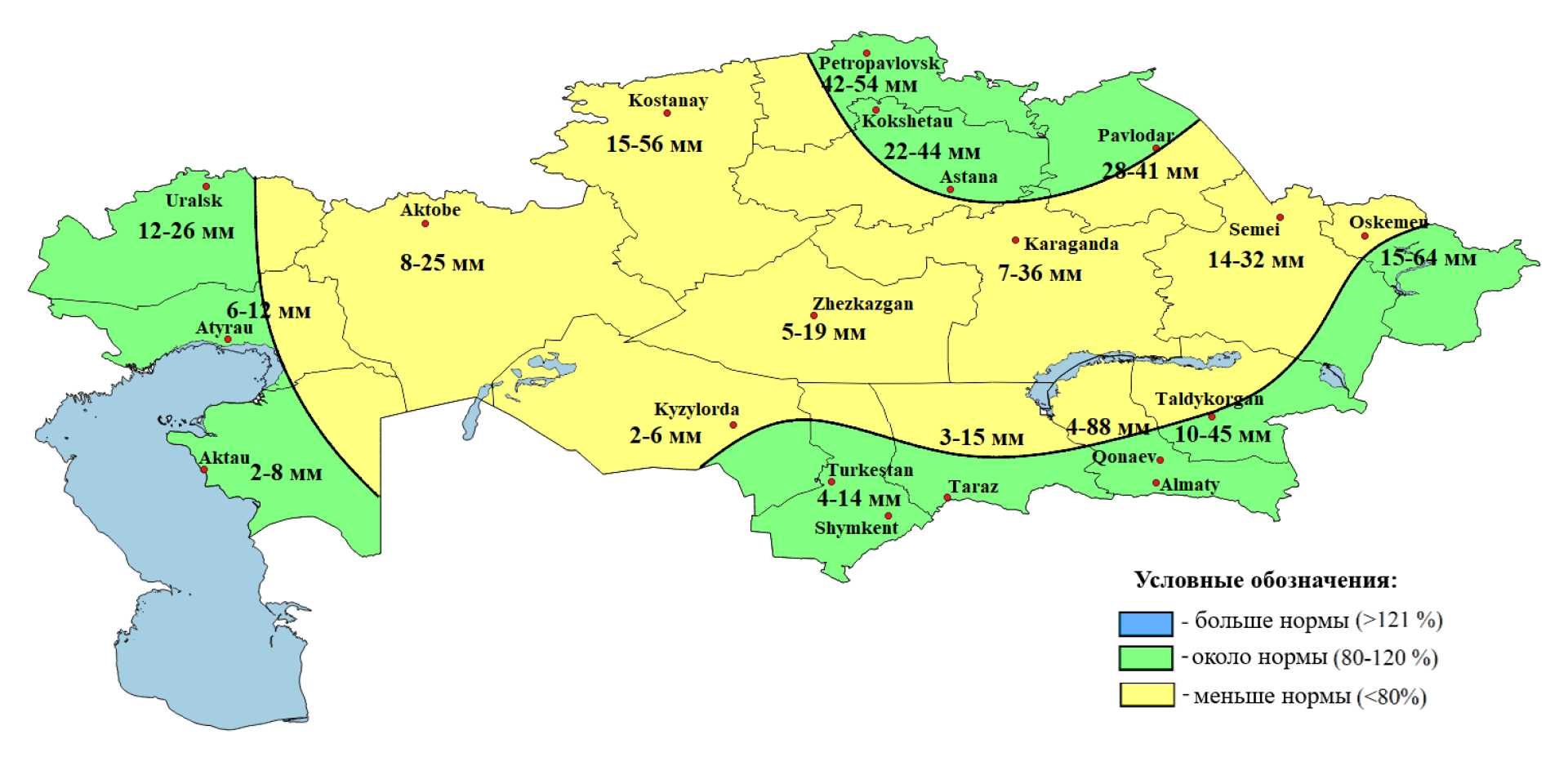 - Ниже нормы — в Мангистауской, Актюбинской, Кызылординской областях и частично в Атырауской и ряде центральных регионов.