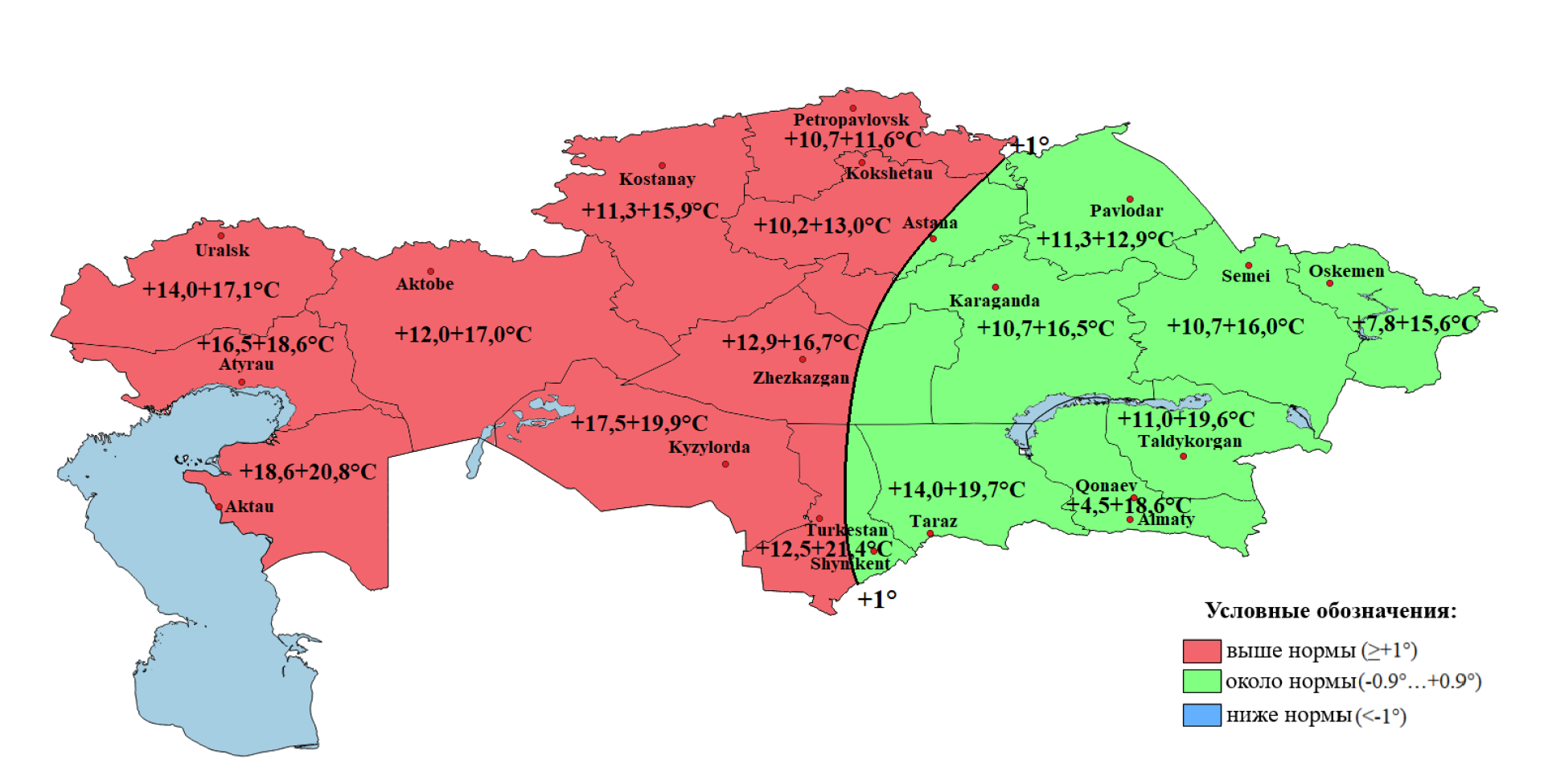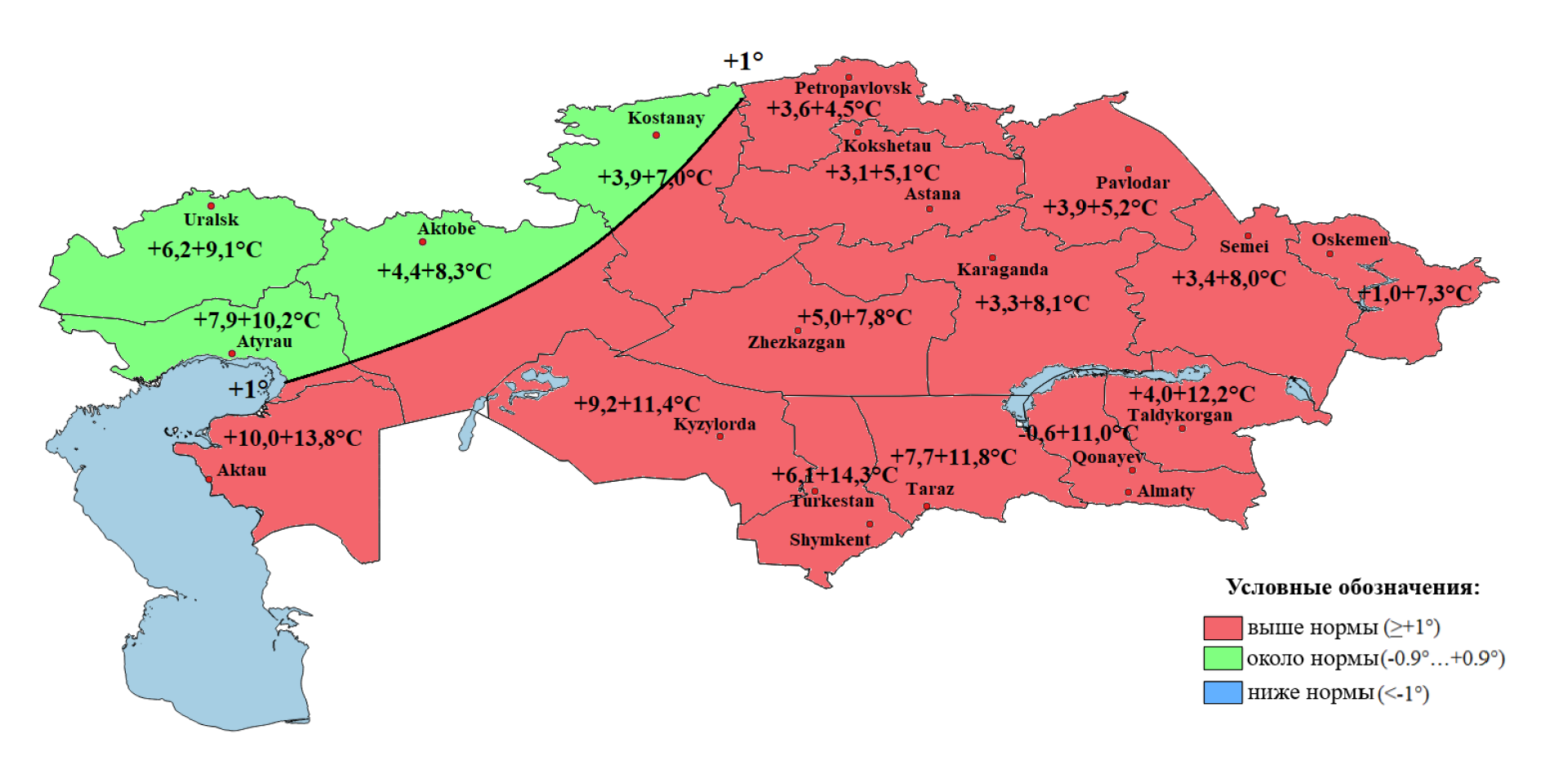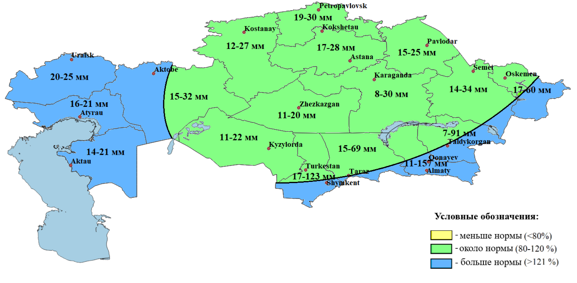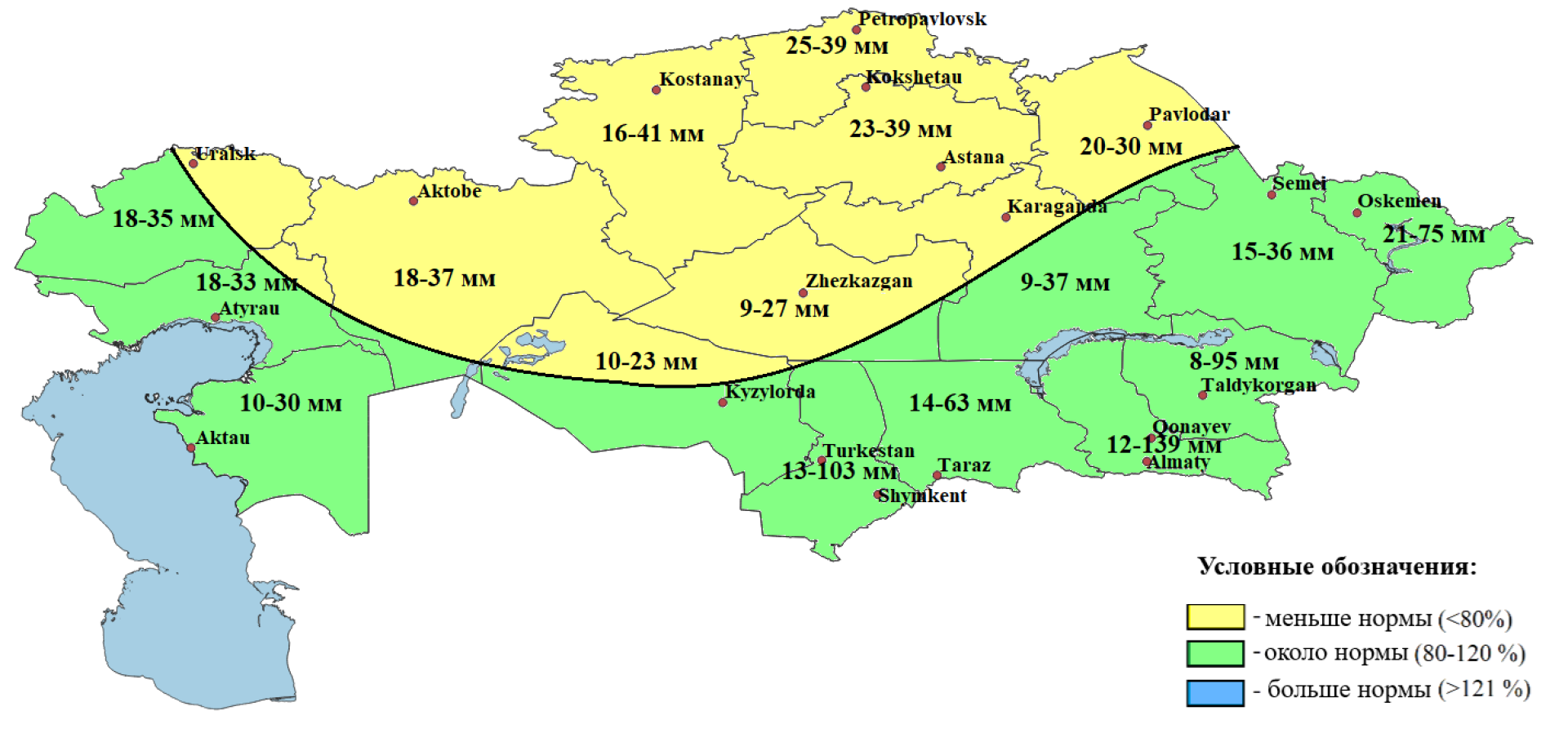 - Ниже нормы — в Мангистауской, Актюбинской, Кызылординской областях и частично в Атырауской и ряде центральных регионов.