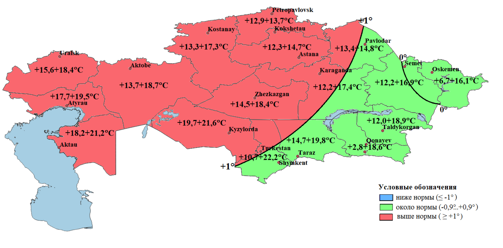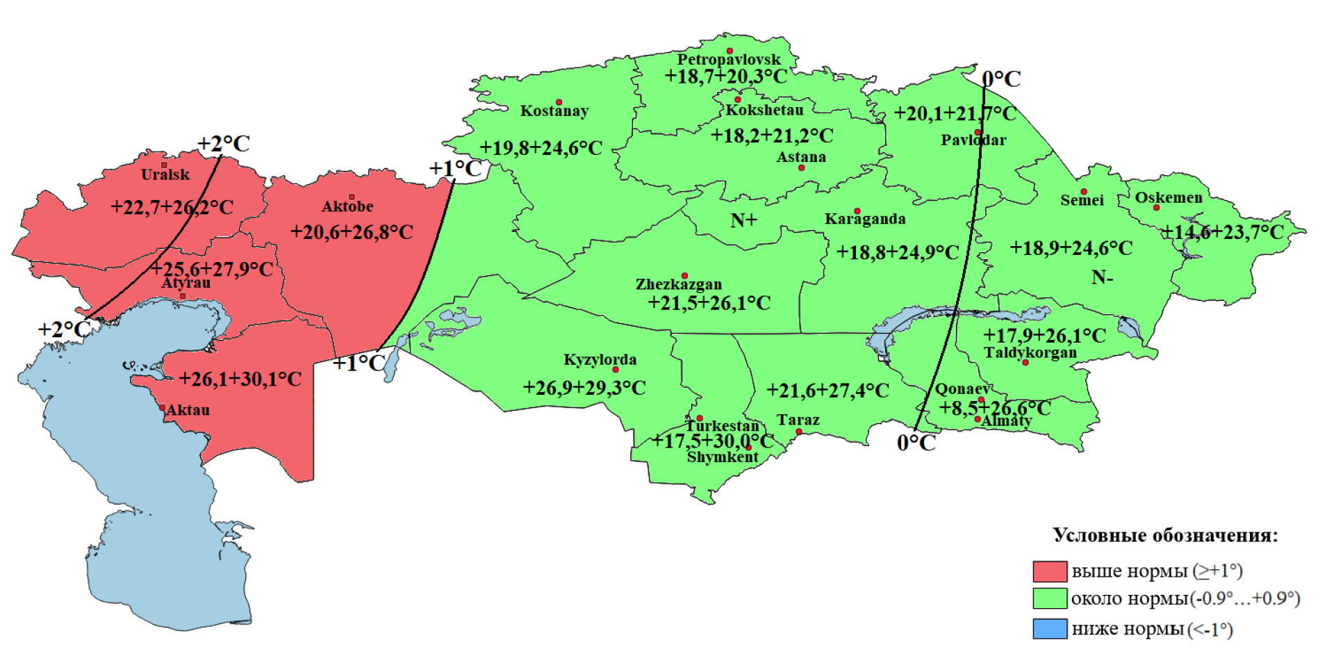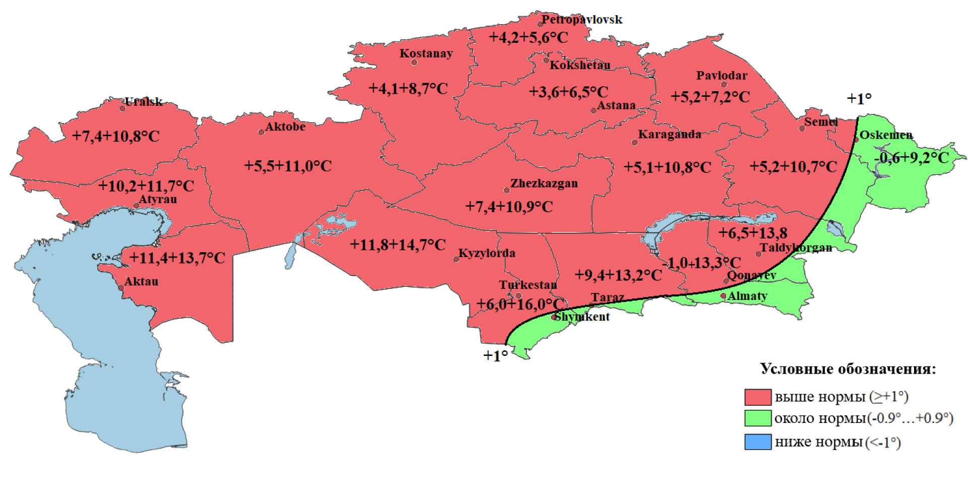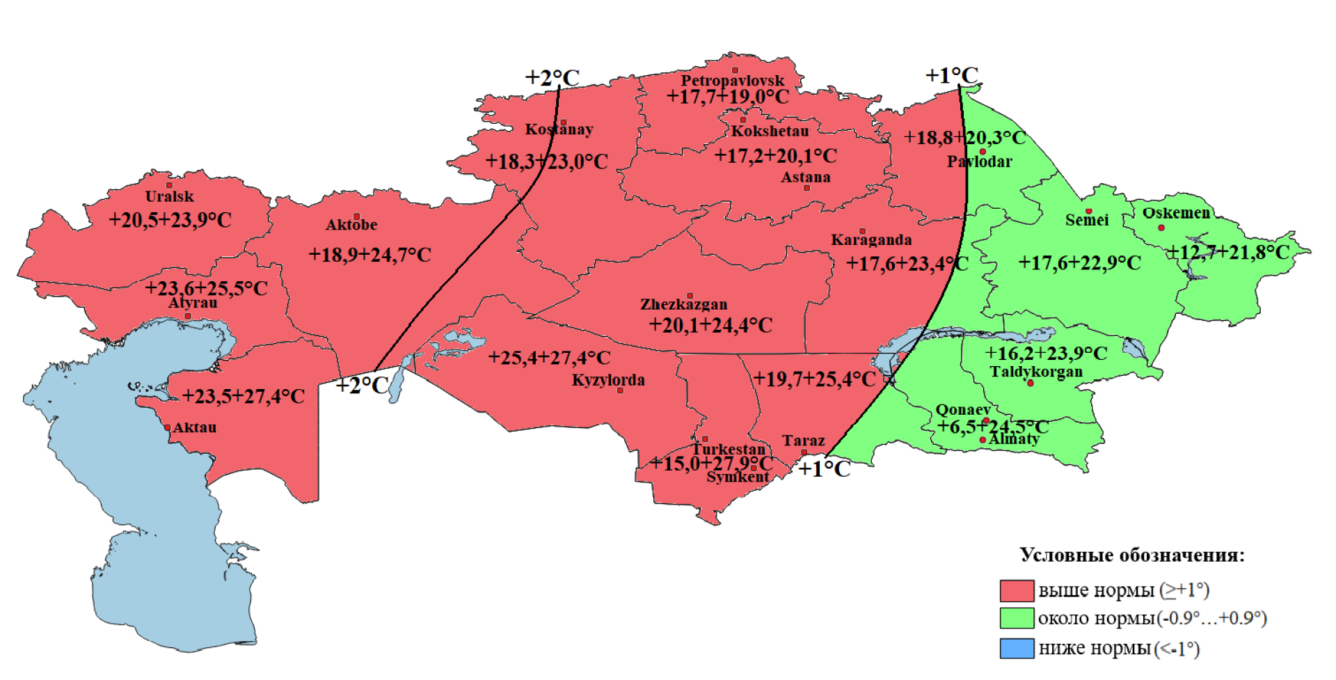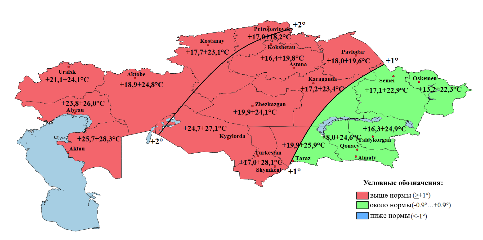 - Ниже нормы — в Мангистауской, Актюбинской, Кызылординской областях и частично в Атырауской и ряде центральных регионов.