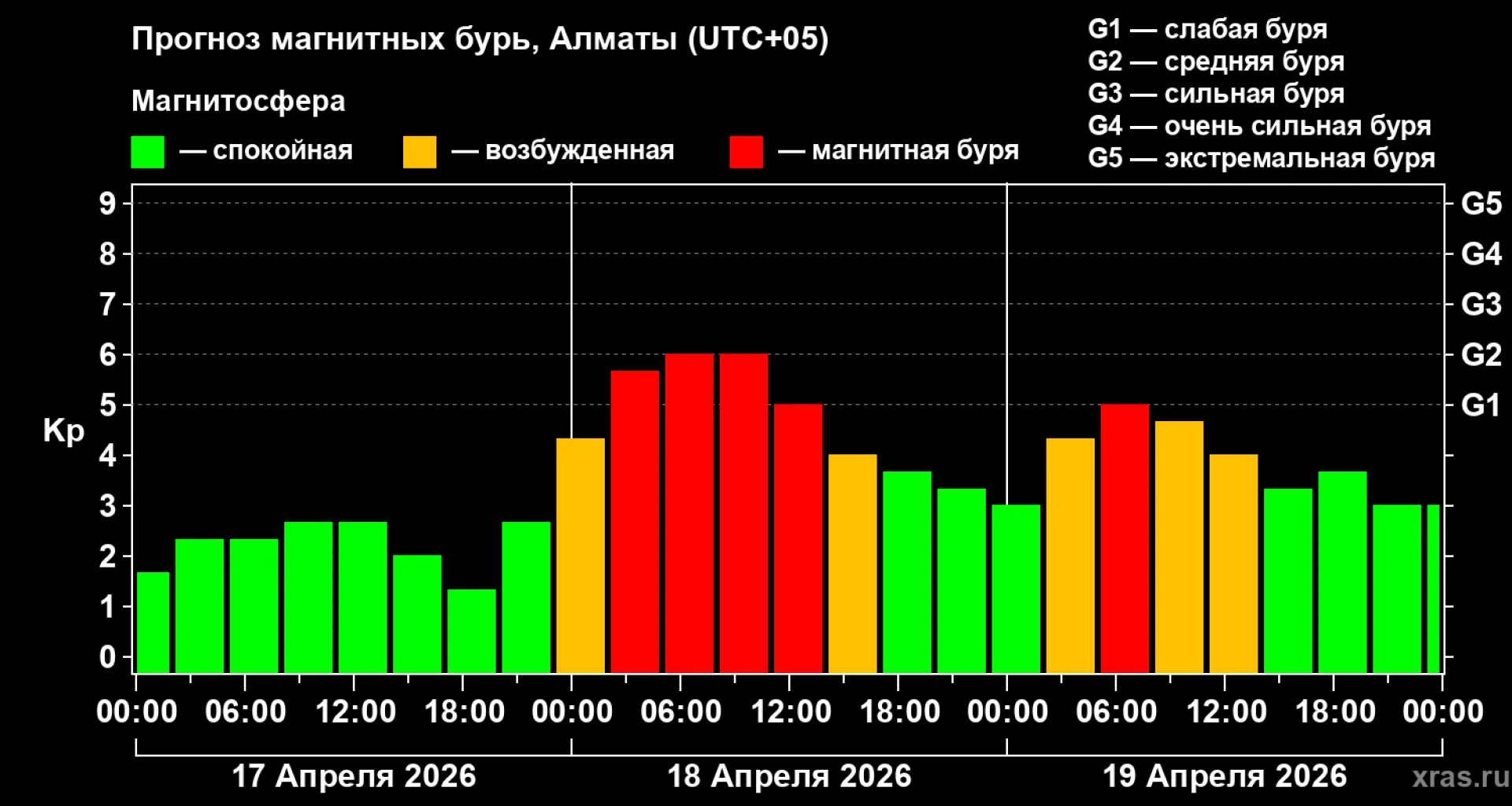 Согласно мониторингу, в Алматы вероятность магнитной бури достигает примерно 90 процентов в первый день и 70 процентов — во второй.