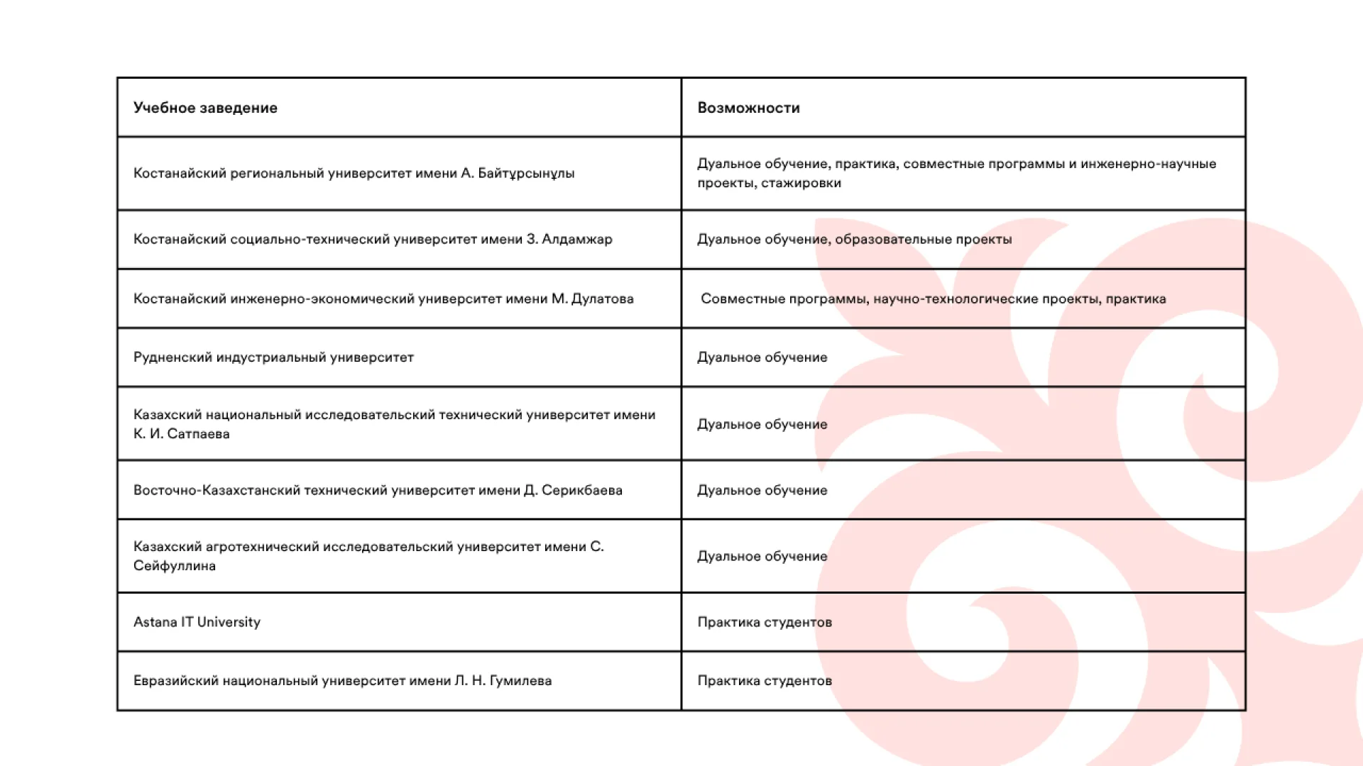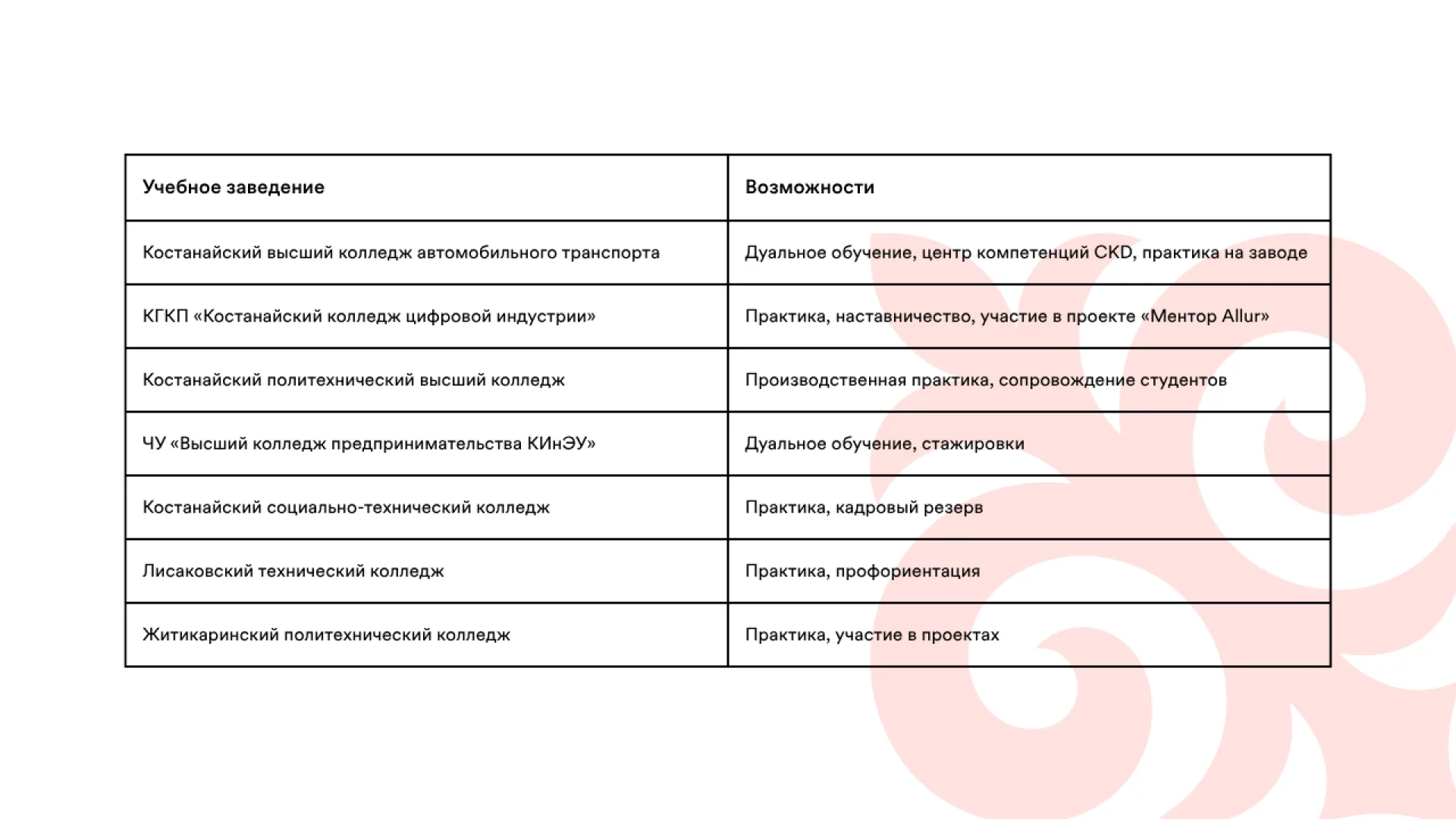 Совместно с заводом Allur трансформируются образовательные программы, реализуются программы производственной практики и стажировок для преподавателей. Компания также участвует в развитии материально-технической базы Костанайского высшего колледжа автомобильного транспорта, где были обновлены библиотека, конференц-зал, спортивные объекты и учебные лаборатории.